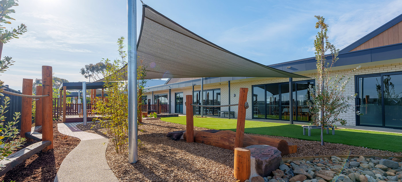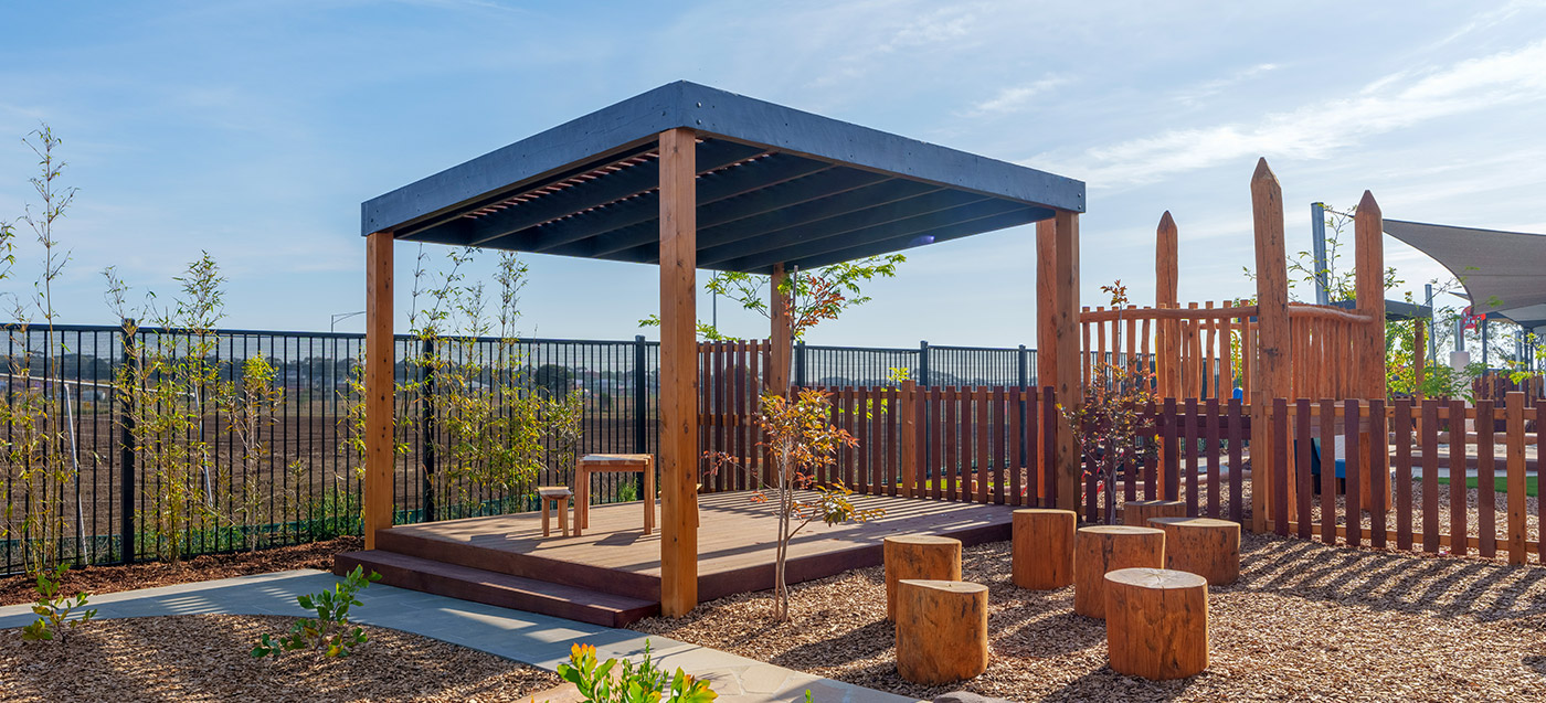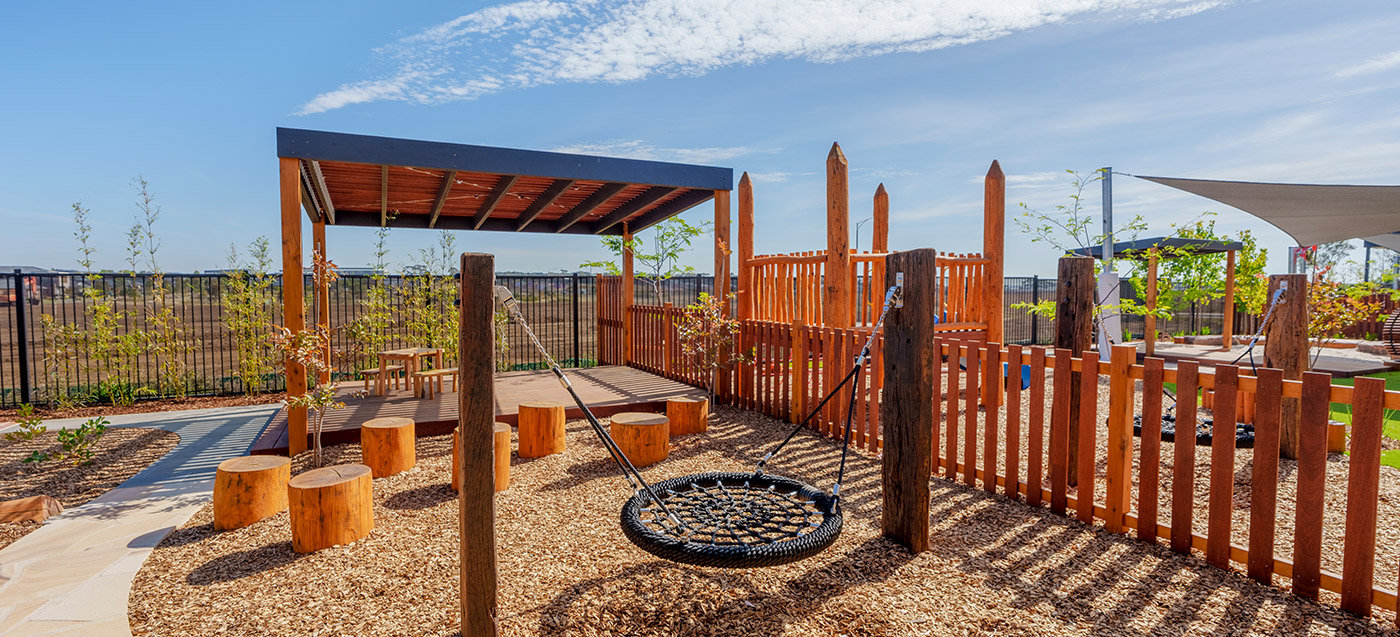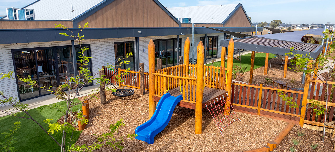 This Armstrong Creek childcare playground project features structured outdoor play and integrated landscape elements. Delivered by specialist childcare landscapers. Designed for safe, high-use childcare playgrounds.